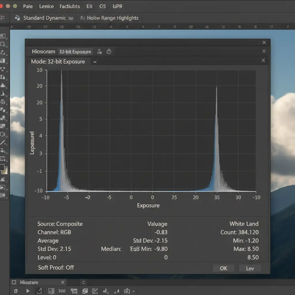 - Open the Histogram panel and set it to 32-bit Exposure mode. This expanded view shows the standard SDR range on the left and the extended HDR highlights on the right.