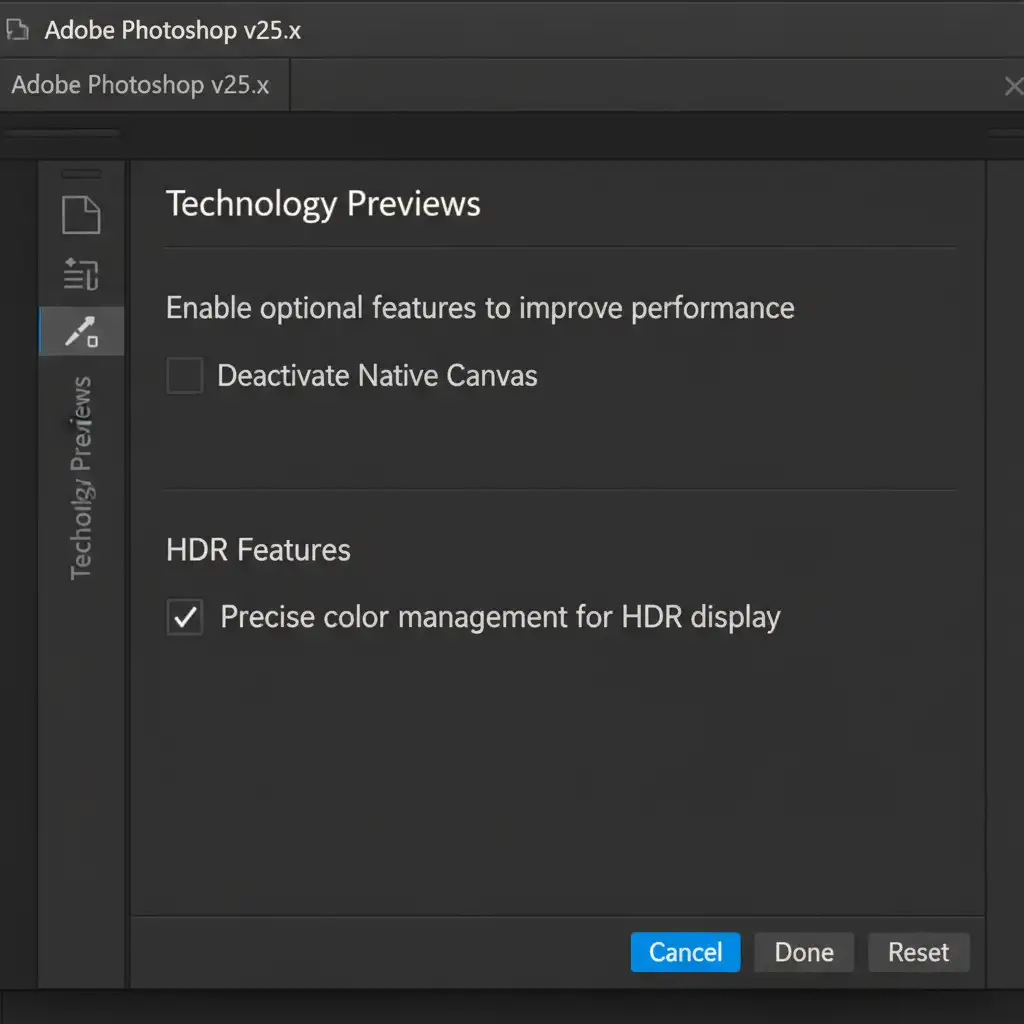 Adobe Photoshop v25.x fully supports Advanced Color for HDR displays, but it requires specific configurations to work correctly. Here are the three essential methods to perfect your workflow.