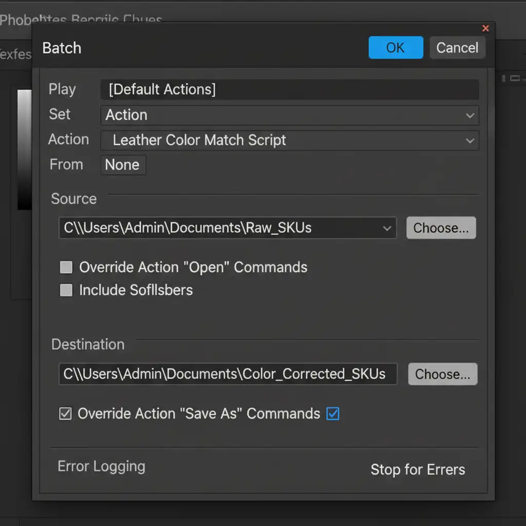- Select your newly created Action, choose your source folder of uncorrected SKUs, and set your destination folder. Let Photoshop do the heavy lifting.