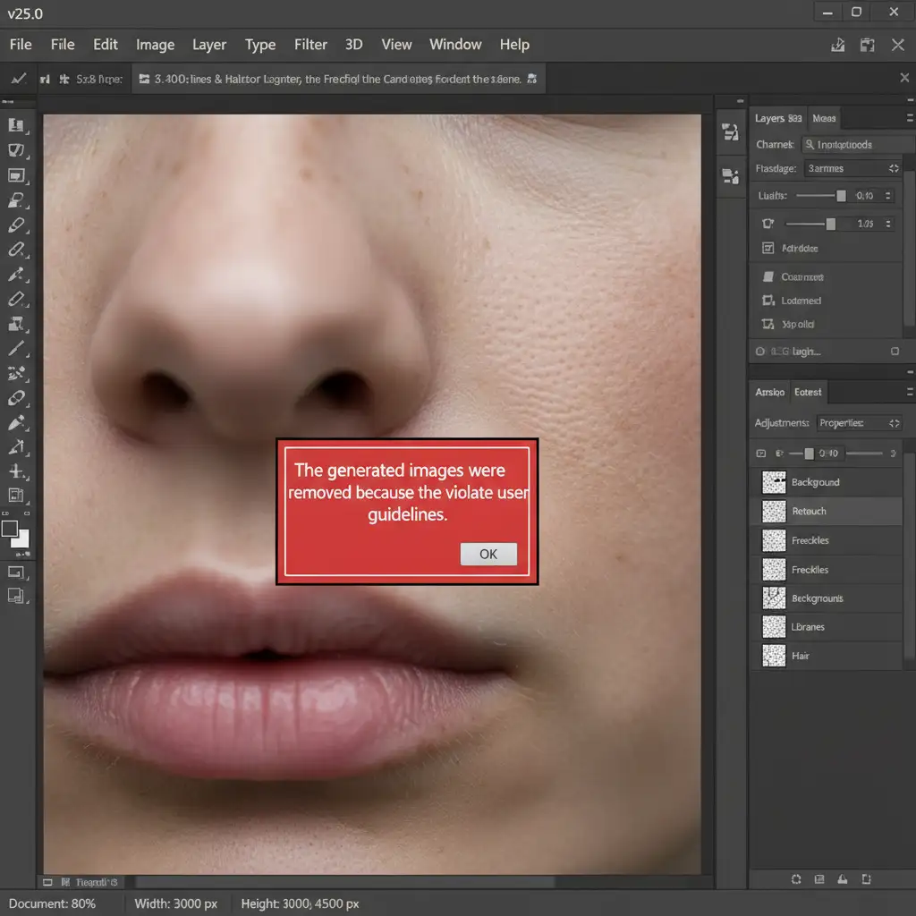You are on a tight deadline, trying to remove a simple blemish or adjust clothing near a model’s skin using Photoshop’s Generative Fill, and suddenly—BAM. A red warning pops up: “The generated images were removed because they violate user guidelines.”