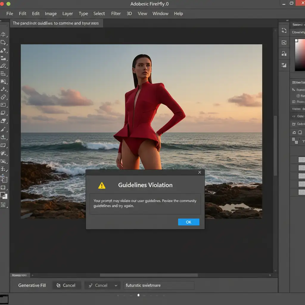 You are on a tight deadline for a high-end commercial campaign. You make a precise selection around a model’s swimwear to remove a stray wrinkle, hit “Generate,” and—bam. A glowing red “Terms of Use violation” error stops you in your tracks.