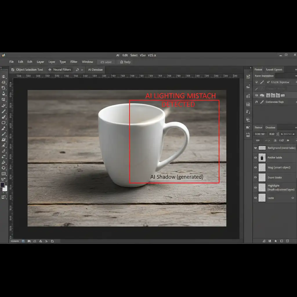In Photoshop v25.x and later, the generative features are powered by Adobe Firefly. While excellent at creating textures and environments, the engine frequently misinterprets global lighting.