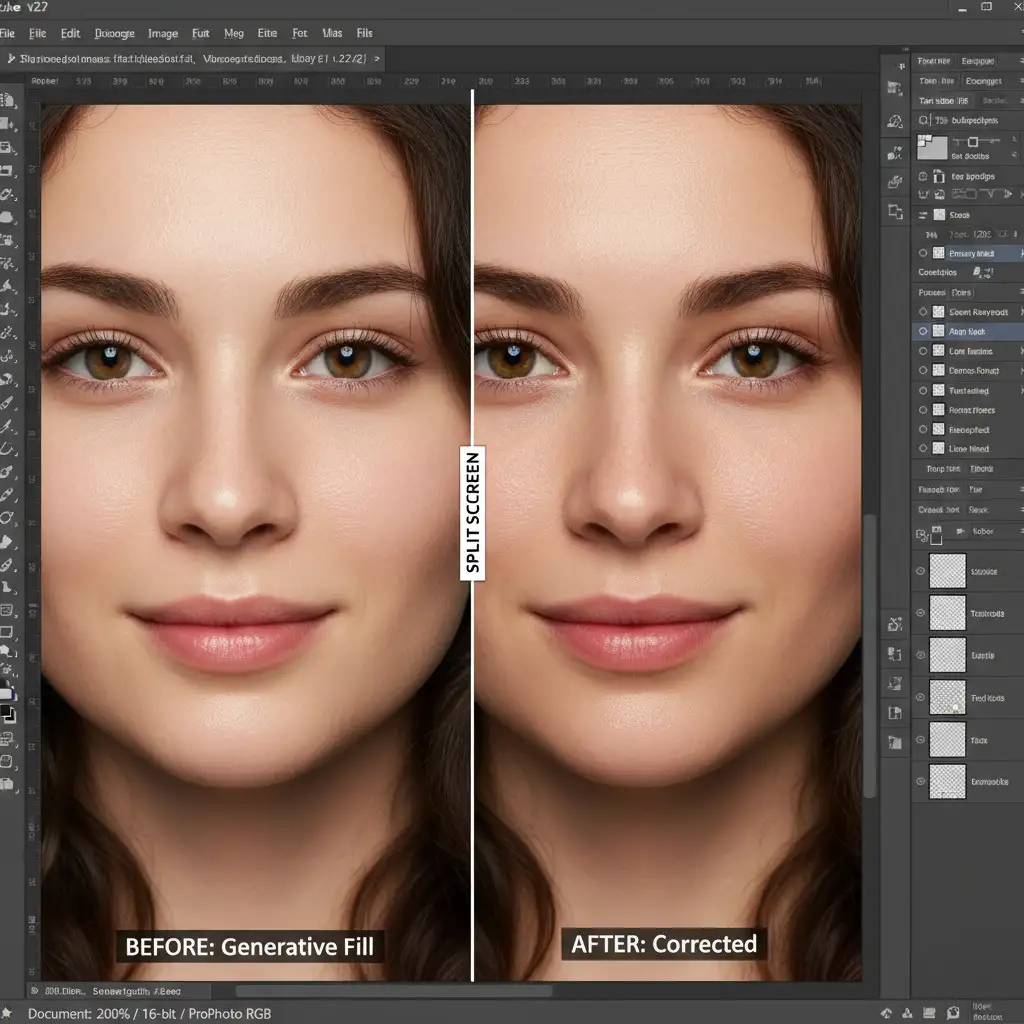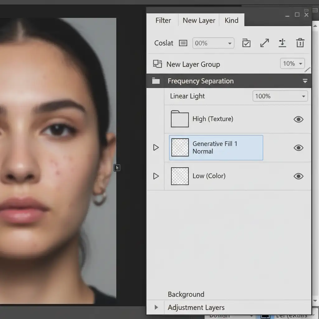 For high-end beauty and fashion retouching, integrating Generative Fill into a frequency separation workflow is the ultimate solution. This method forces the AI to only affect the underlying color, completely preserving the original, unaltered skin texture.