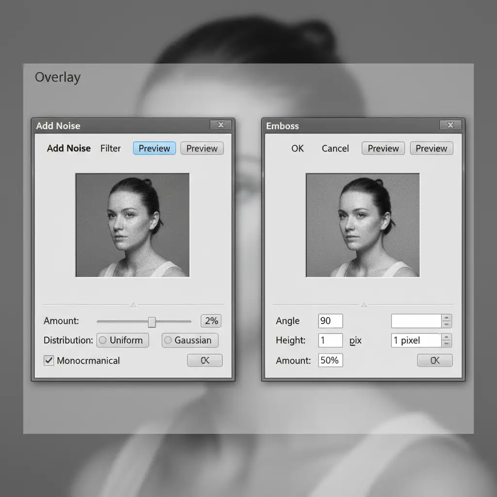 - Navigate to Filter > Noise > Add Noise. Set the amount to 2% – 3%, and ensure Uniform and Monochromatic are checked.