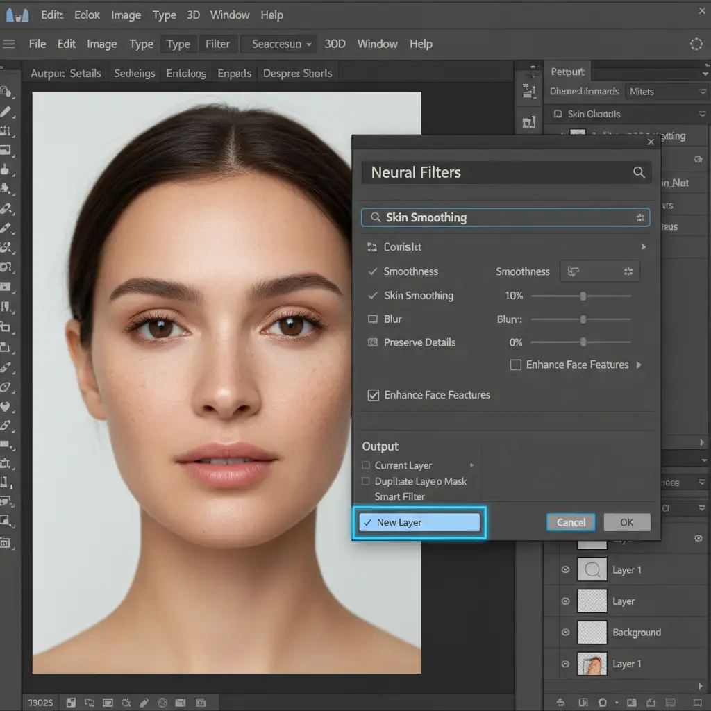 In Photoshop versions 24.x through 26.x, the Skin Smoothing Neural Filter relies on Adobe Sensei to automatically identify faces and blur out imperfections. While the technology is fast, it lacks the nuanced eye of a human retoucher.