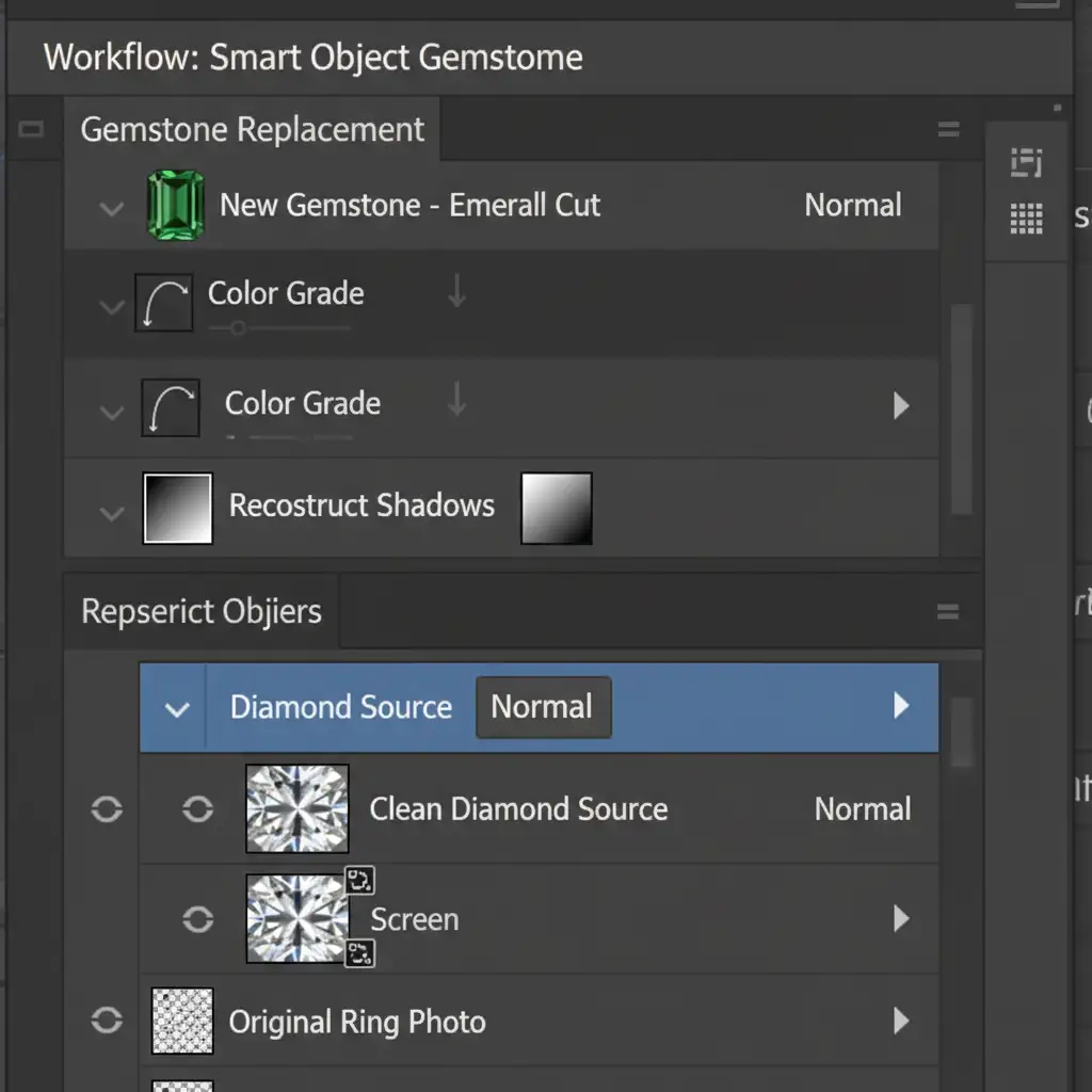 Sometimes, the original diamond is already heavily damaged by camera glare or poor studio lighting, meaning you can’t simply mask it. If Generative Fill fails to rebuild it, you must execute a complete gemstone replacement.