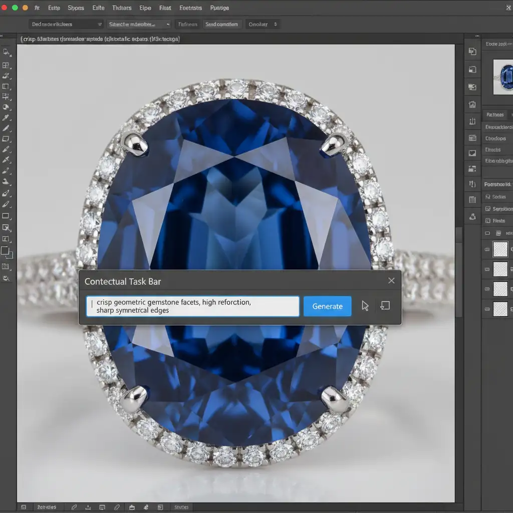 - Targeted Generation: Run Generative Fill to clean up the metal ring band or background. Because the gemstone is masked out of the selection, its original geometric precision remains untouched.