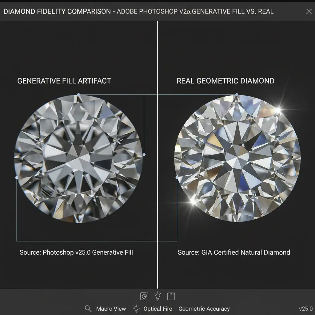 However, diamonds are completely unnatural to an AI. They require absolute geometric precision. The AI lacks contextual awareness of optical “Fire and Brilliance” and the complex refraction index of a gemstone. When Firefly analyzes the sharp, high-contrast faceted reflections of a diamond, it interprets them as random image noise. It attempts to “fix” this noise by smoothing it out, resulting in Generative Fill artifacts that completely destroy the commercial value of the jewelry image.
