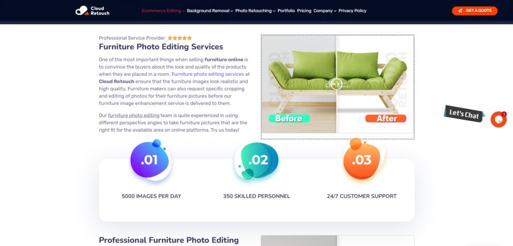 The company offers a wide range of furniture photo editing services, including color correction, retouching, background removal, and more. Moreover CCP also offers a money-back satisfaction guarantee to its clients.