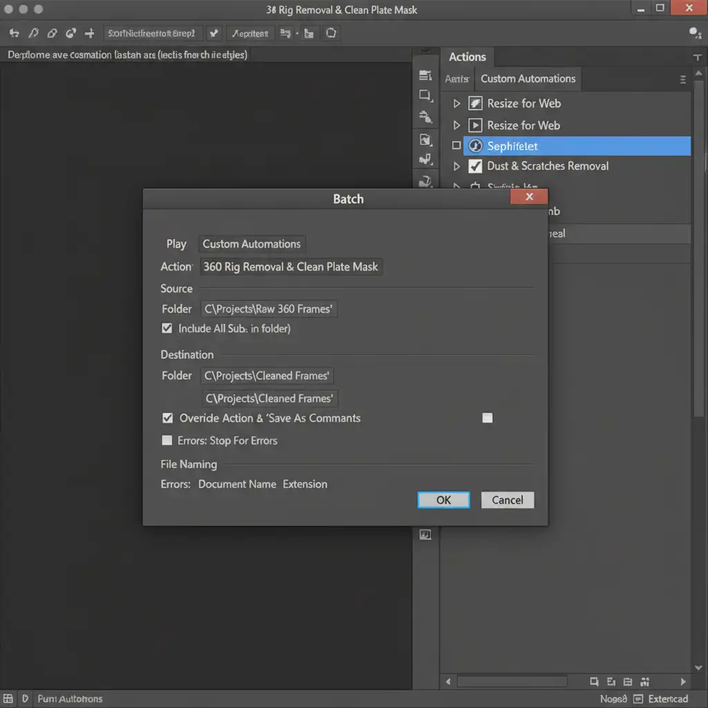 With your Action recorded, you can now automate the entire 360 spin. Navigate to File > Automate > Batch. Select your source folder (your 72 raw frames), apply your new Action, and set a destination folder. Photoshop will seamlessly replace the rig with the clean plate across every single frame with zero manual brushwork, ensuring absolute consistency.