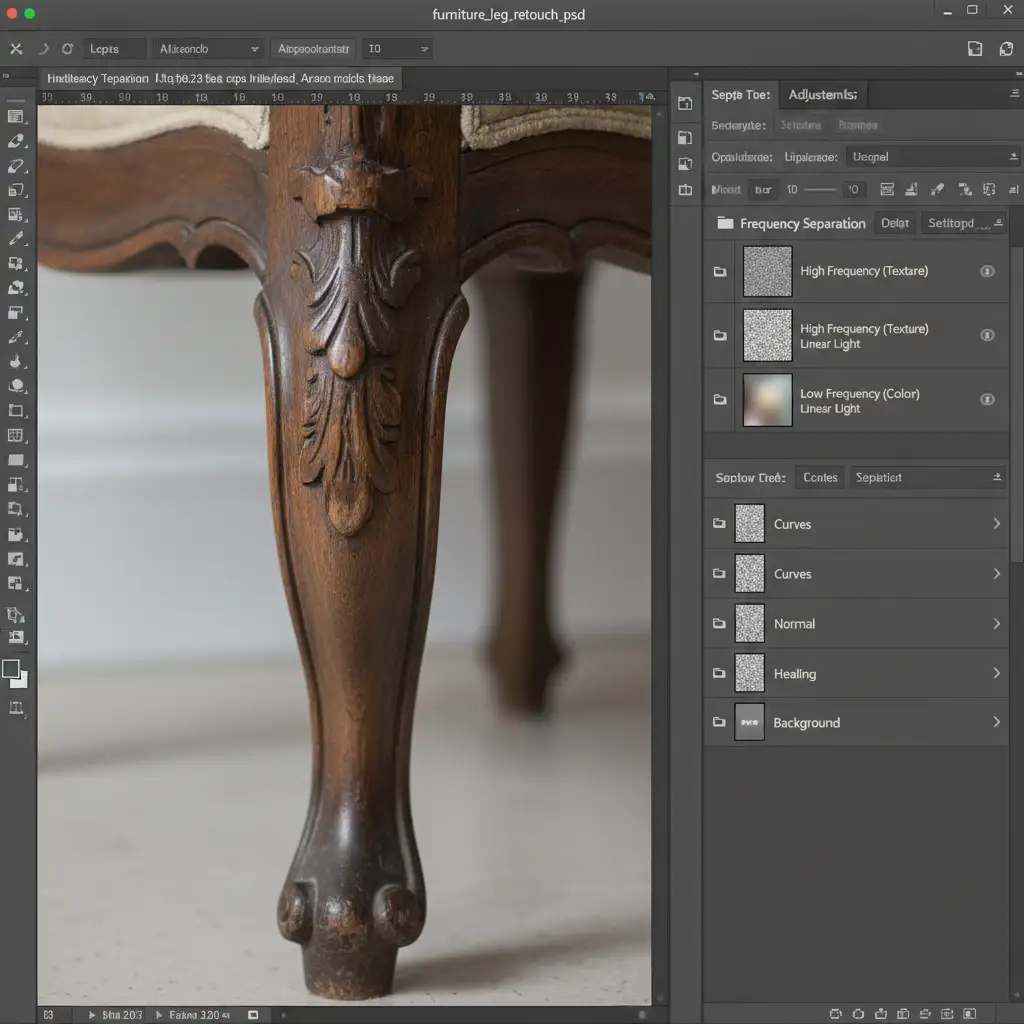 When the turntable rig overlaps complex wood grain or fabric textures on the bottom of the furniture, automated tools often fail. Frequency Separation allows you to edit the color of the rig out without destroying the texture of the product.