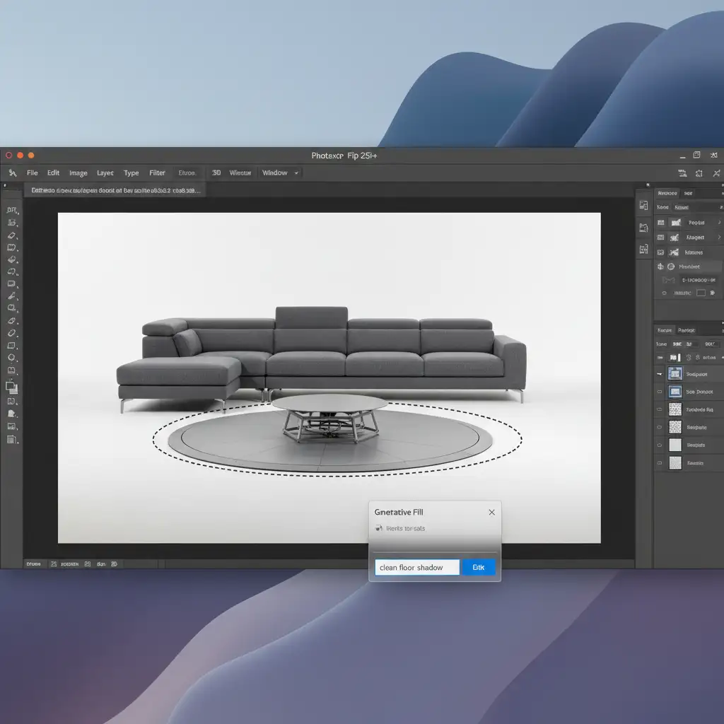 - Generate and Verify: Hit Generate. Photoshop will provide three variations. Choose the one that best preserves the furniture’s geometry and grounding shadow.