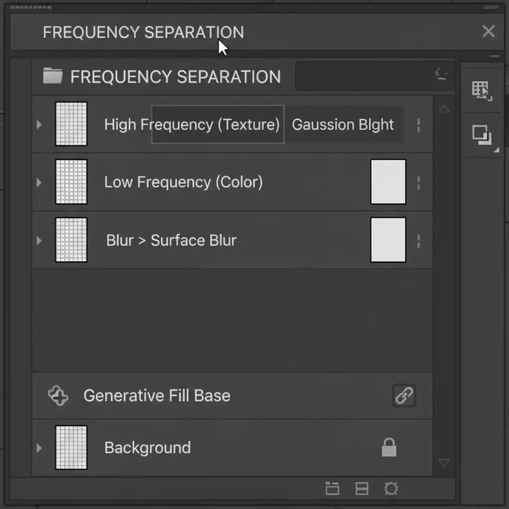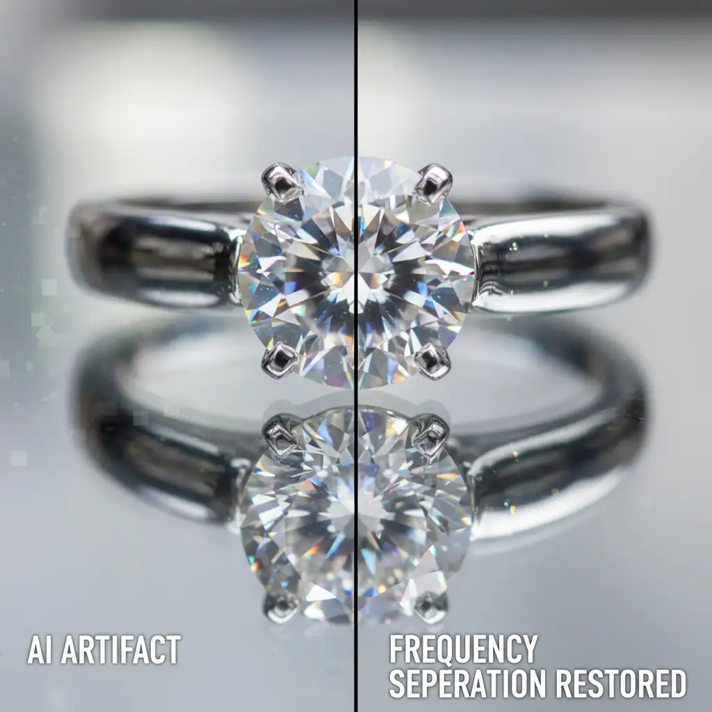 Sometimes the AI gets the overall shape of the reflection right, but introduces heavy color banding or muddy textures. In these cases, Frequency Separation is the ultimate weapon to isolate and fix the artifacts without destroying the underlying pixels.