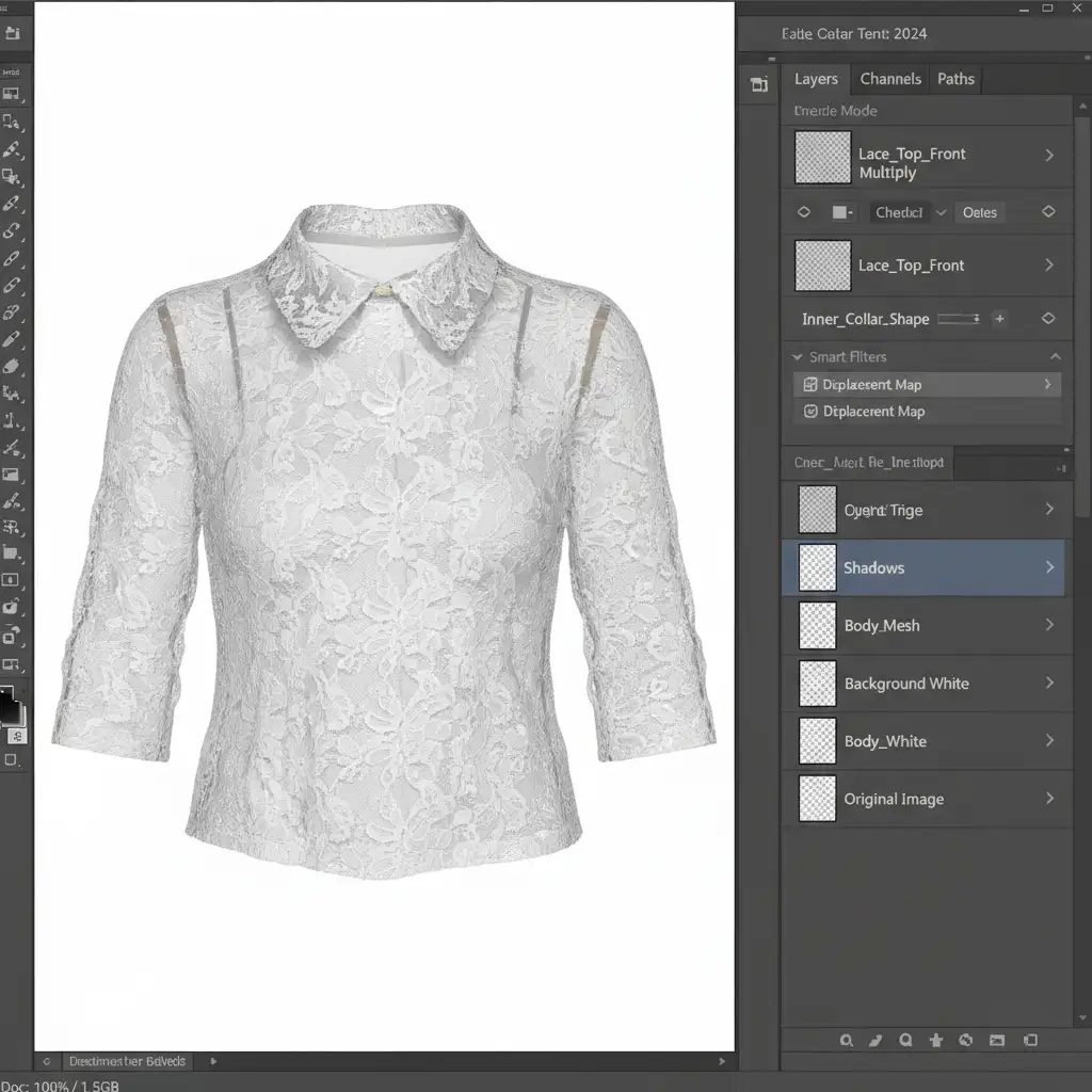 However, sheer fabrics demand absolute opacity preservation. You cannot simply use the Select and Mask workspace to cut out holes in lace. To achieve a high-end e-commerce standard, you must extract the delicate thread lattice while maintaining natural transparency over the interior collar shot.