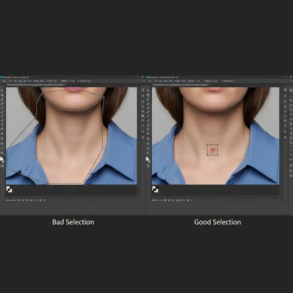 - Instead of selecting a wide area, make micro-selections strictly around the specific blemish or stray hair.