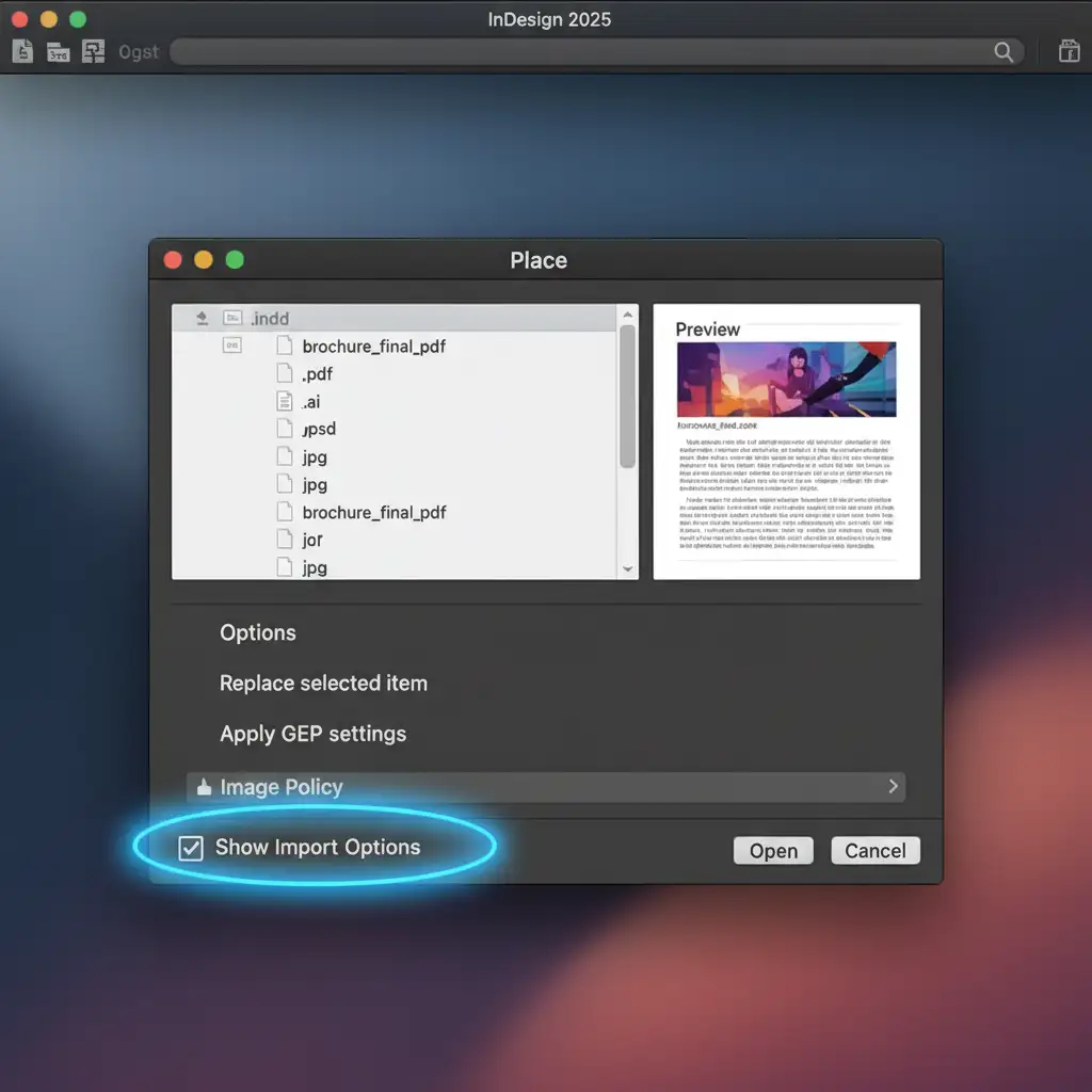- In the Place dialog box, check the Show Import Options box at the very bottom.