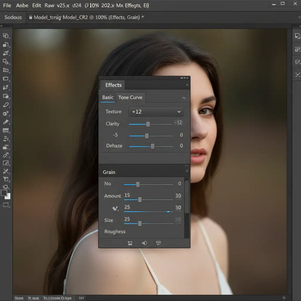 The biggest giveaway of a retouched UGC ad is the sudden lack of digital noise in the edited areas. Smartphone cameras naturally produce a specific grain structure. To unify your retouched areas with the rest of the image, utilize the Camera Raw Filter.