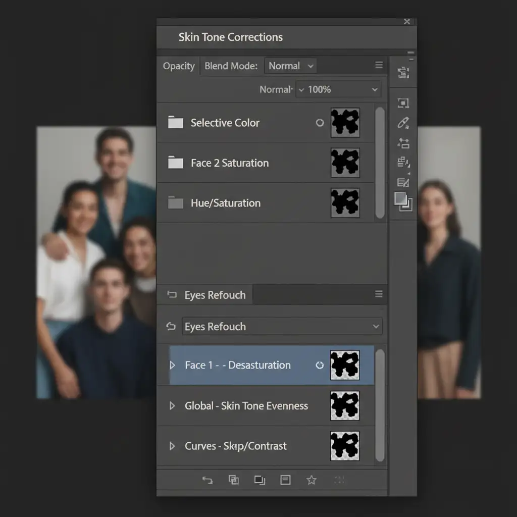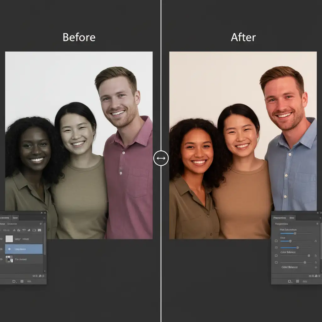 In modern Photoshop versions (v24.x and v25.x), applying global LUTs or white balance shifts to a group photo is a recipe for unnatural color casts. Because melanin density varies drastically, a single adjustment layer cannot accurately interpret the optimal red, yellow, and cyan ratios for every face in the frame.