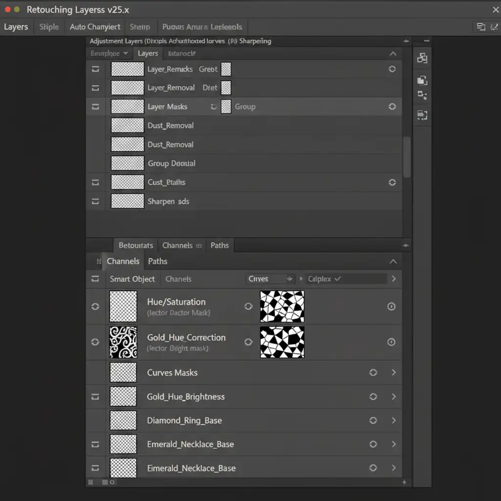 - Finally, save the file as a layered TIFF. This preserves the active paths, vector masks, and adjustment layers, providing your e-commerce client with ultimate flexibility if they need to tweak the brightness of a specific gem later.