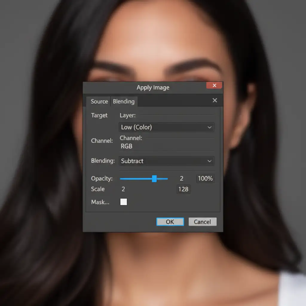 The most critical step in frequency separation is the Apply Image command. This is where Photoshop subtracts the blurred color data from the original image to isolate the texture. The math changes entirely depending on your document’s bit depth.
