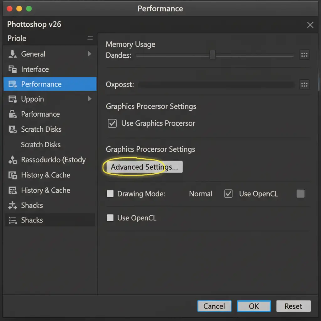 - Advanced Settings: Click the Advanced Settings button within the Performance tab and verify that Use GPU for Image Processing is actively enabled.