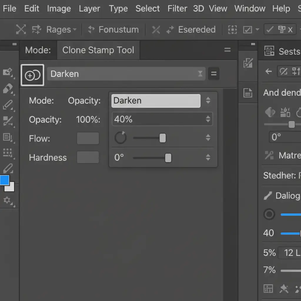 - Configure the Top Menu: In the top options bar, change the Blend Mode to ‘Darken’. Set your Opacity to roughly 40 percent. Ensure “Sample: Current & Below” is selected.