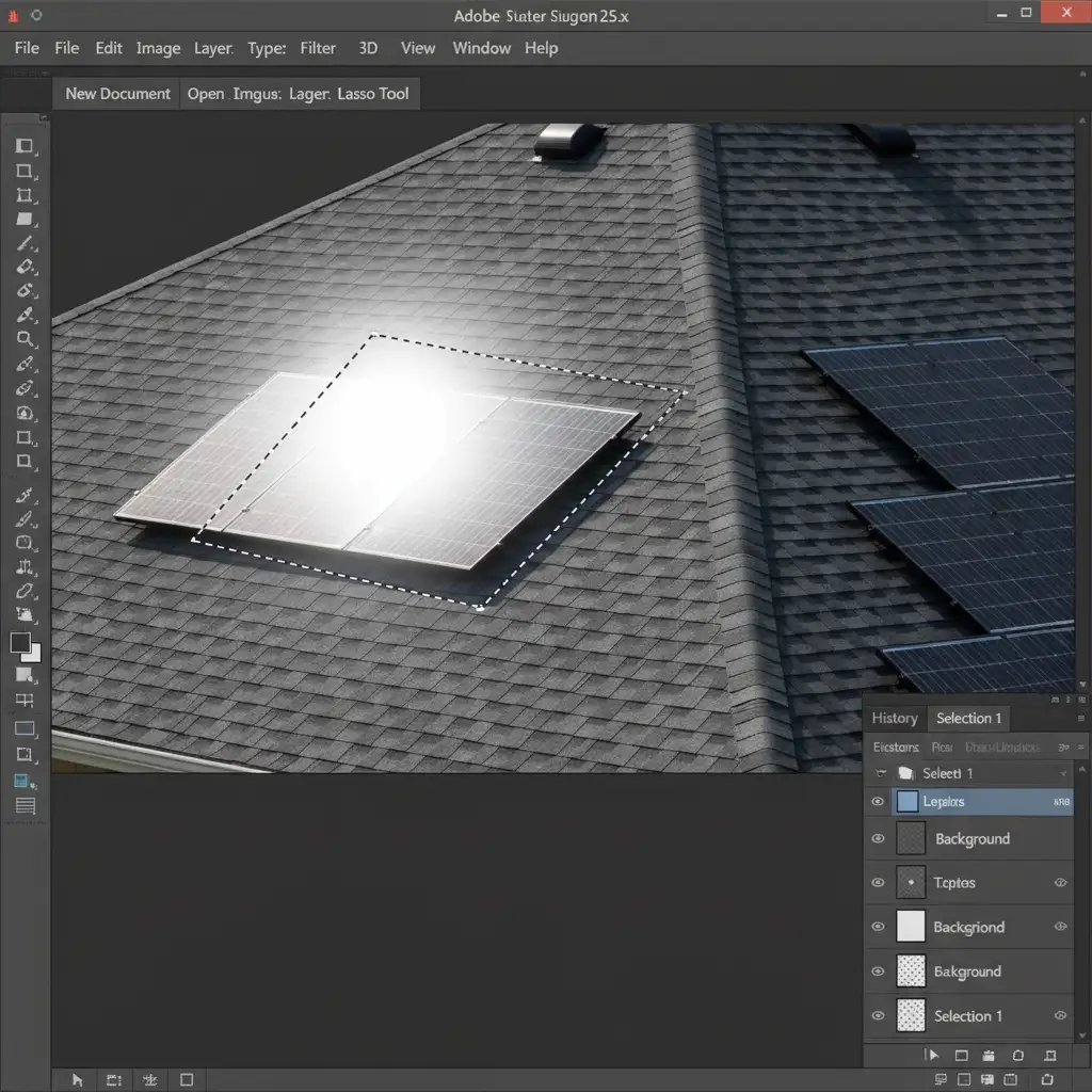 - Select the Glare: Select the Polygonal Lasso Tool (L). Carefully click to trace the exact geometric boundary of the glared solar panel. Keep your selection tight to the edges.