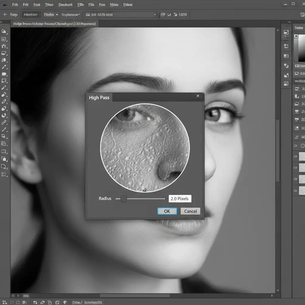 - Apply the High Pass Filter: With the duplicated layer selected, navigate to Filter > Other > High Pass. Set the radius to between 1.5 and 3.0px (just enough to see the pores without seeing color shifts).