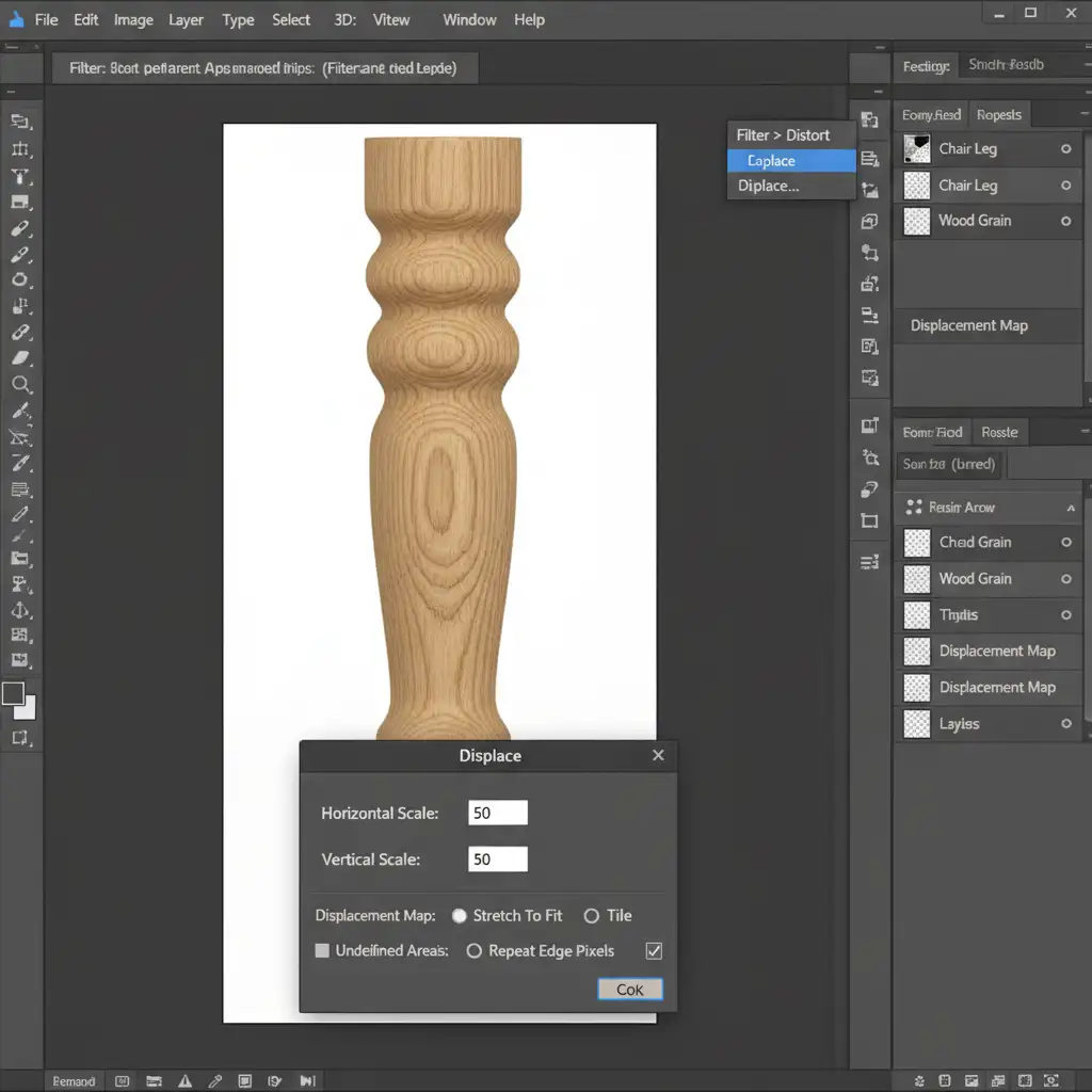 - Select the .PSD file you just saved. Photoshop will use the light and dark values of the AI-generated furniture to physically warp and bend the wood grain pattern so it perfectly hugs the curves and edges of the object.