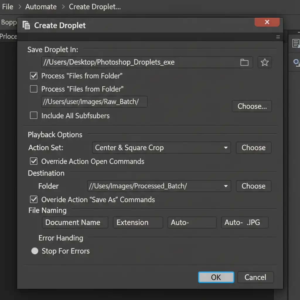 Now, you can drag and drop folders containing thousands of raw images onto this Droplet. Photoshop will pre-process, center, and crop every single image identically, leaving the retoucher to focus solely on the invisible mannequin compositing.