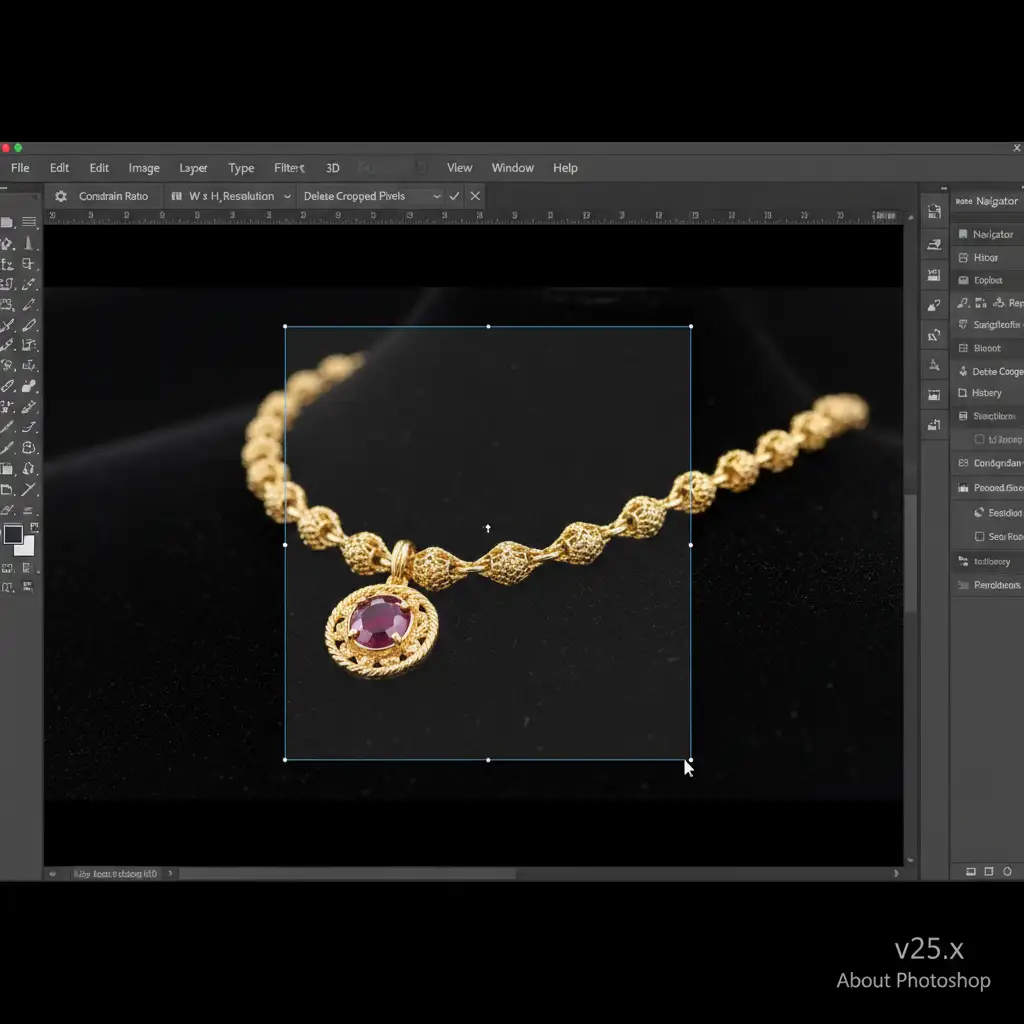- Set the Aspect Ratio: Select the Crop Tool (C) in Photoshop. In the top options bar, set the dropdown to 1:1 Square. Frame your jewelry dead-center.