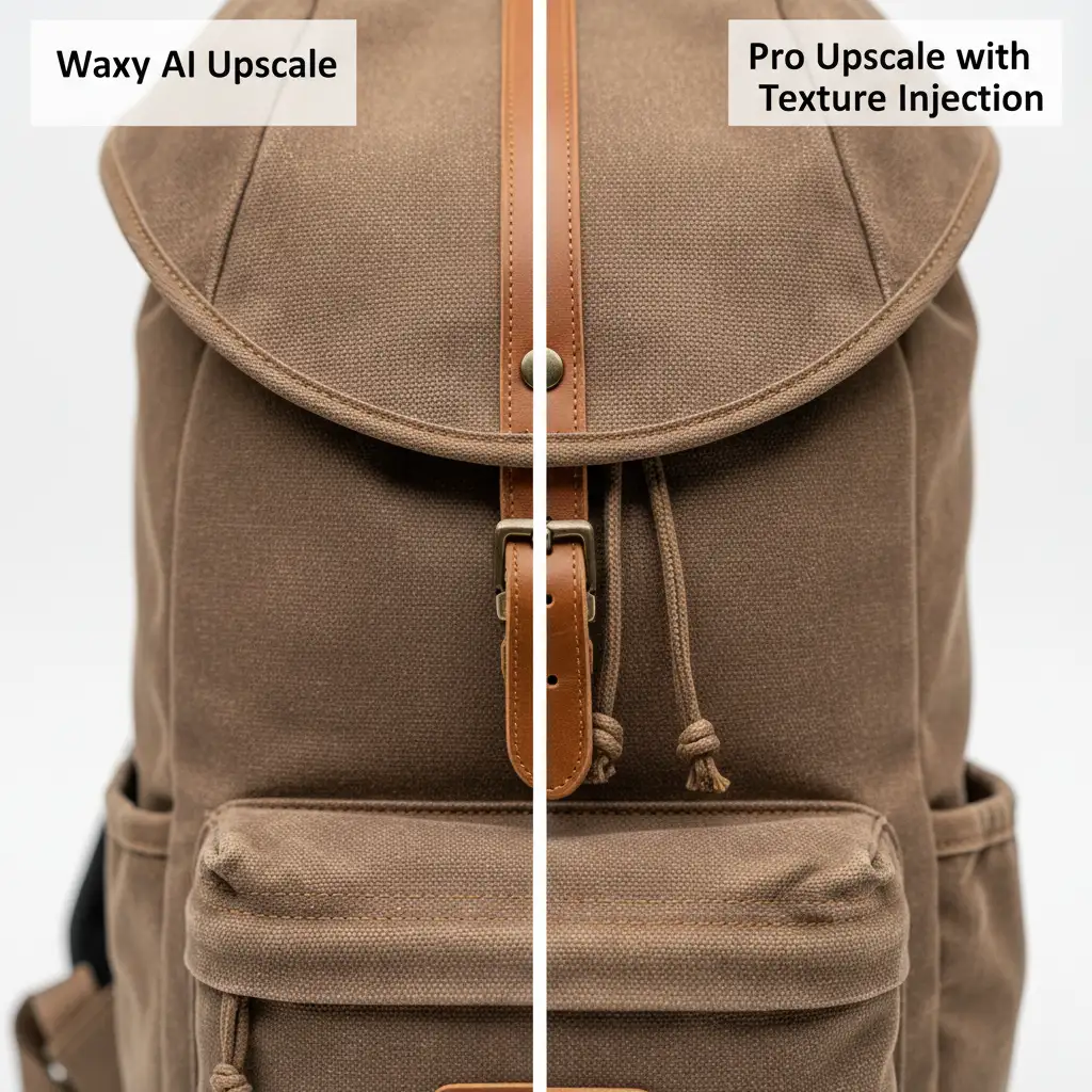 This is the dreaded “waxy” AI effect. When upscaling low-res product photos for Amazon 2024 requirements, standard AI tools and older image interpolation algorithms aggressively denoise your images. They destroy the natural textures that convince customers to click “Add to Cart.”