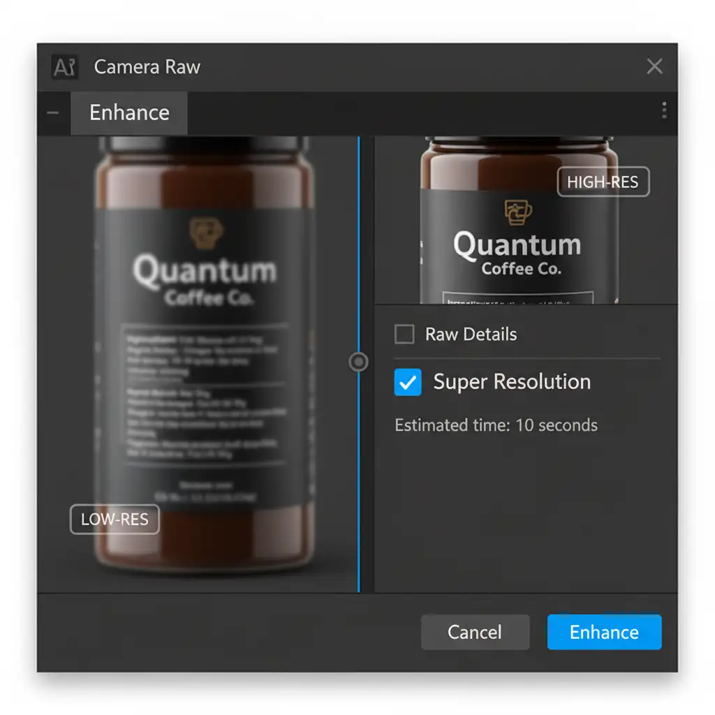 - Right-click the image preview inside Camera Raw and select Enhance. Check the Super Resolution toggle to double the pixel count intelligently. Click OK.